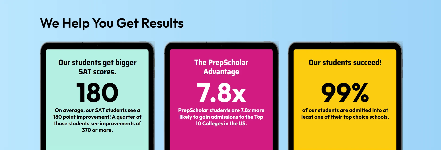 - Proven Results: PrepScholar reports an average 180-point SAT gain for students, and claims 99% of its students get into a top-choice college. (These stats come from their data on thousands of users.)