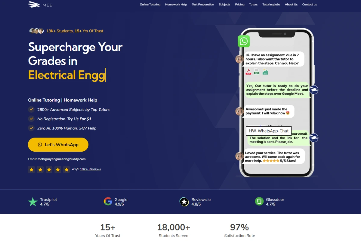 Pros: My Engineering Buddy (our platform) offers real tutors for STEM subjects, which QuillBot does not. We cover advanced courses like engineering, physics, math, and computer science – areas where automated tools can’t give step-by-step help. We offer 1:1 sessions and written solutions. Our site shows we’ve served 18,000+ students with a 4.7/5 rating. Many reviews from U.S. college students praise original, high-quality homework help. Cons: Unlike QuillBot, MEB is not an instant free tool – you must schedule help or submit questions. Pricing is per session or solution (not a simple subscription). Also, QuillBot covers any writing topics, but MEB focuses on specific STEM areas. Overall, MEB excels for complex homework problems, while QuillBot excels for writing tasks.