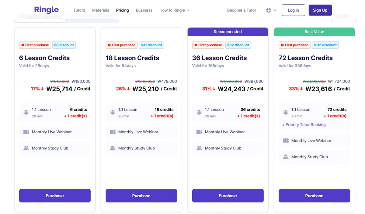 Students must prepay. Lessons are sold as credits or monthly plans. For example, one buys a slot on Ringle’s calendar (a credit is deducted). Payment is via credit card (or Apple/Google in-app purchases) at booking. Ringle does not allow “pay after” sessions – you must have credit before the lesson. They do not advertise special discounts (no student/army deals found), but occasionally offer promotions (e.g. referral codes). In summary, you buy a bundle or subscription up front, then schedule lessons against that balance.