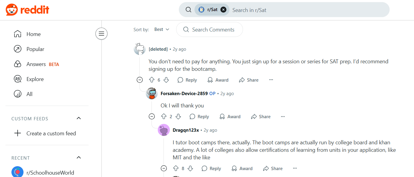 Many students and parents love that Schoolhouse is free. On Reddit, one user explained that you “don’t need to pay for anything” and can simply sign up for SAT prep sessions at no cost. Others note that the free access is a big benefit compared to paid tutors. Reviews on the Schoolhouse site also thank volunteers for providing valuable help at no charge.