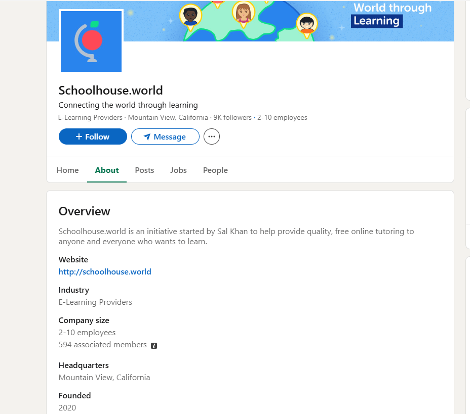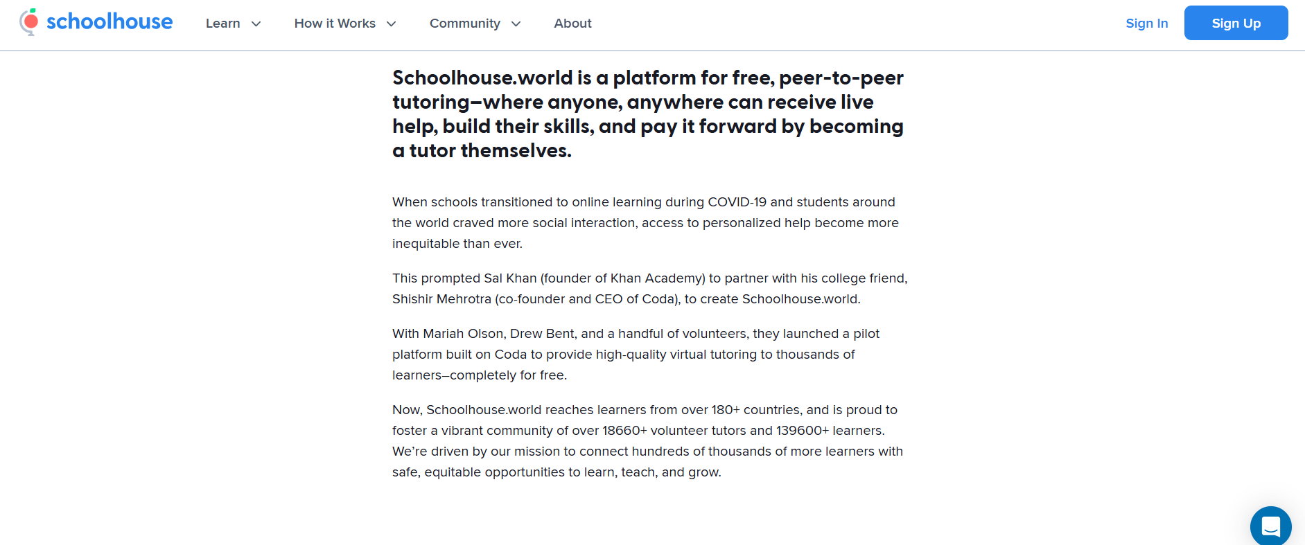 Founding: Schoolhouse.world was created by Sal Khan (founder of Khan Academy) and Shishir Mehrotra (founder of Coda) in 2020. It started as a pilot during the COVID-19 pandemic and relaunched in January 2021.