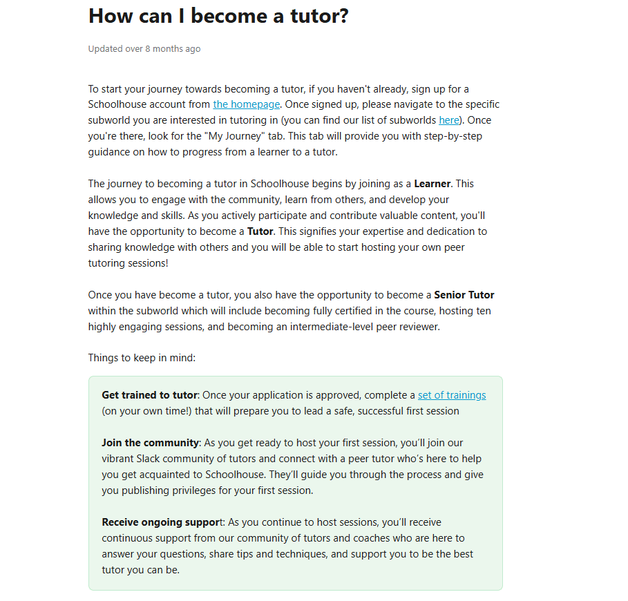 To become a tutor, one must sign up on Schoolhouse and get certified in a subject. The certification process involves choosing a topic (often a Khan Academy unit), passing a test with at least 90% while recording your work on video. The video and results are then reviewed by peers. Once approved, tutors receive training on how to run sessions. Tutors must be at least 13 years old, but they do not need a formal degree. After training, tutors can host sessions on any schedule. They list topics they know and open live sessions or series for students. As Schoolhouse notes, tutors “host sessions on your own schedule, in topics you know”. The community of volunteer tutors supports each other by peer-reviewing and mentoring. In short, tutors sign up, certify their skills via a quiz-and-video, then open free help sessions for learners.