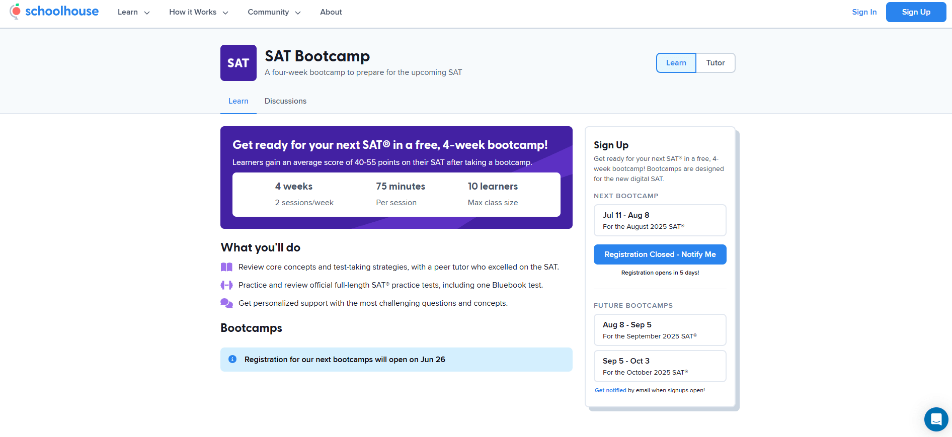Services and Subjects: Schoolhouse offers small-group live tutoring sessions in academic subjects. Key offerings include SAT prep, college admissions workshops, math labs, science help, and discussion clubs. In fact, learners can attend sessions on “hundreds of topics” from algebra to biology, and earn mastery certificates. The platform also runs special programs like SAT® bootcamps and college workshops. All services are online and free.