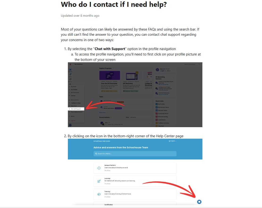 Schoolhouse.world provides an online Help Desk for any issues or questions. Users are instructed to contact user support via the Schoolhouse Help Desk if they have concerns. The platform also has clear rules: tutors must complete training on online safety and respectful teaching. All participants agree to terms that forbid cheating or abuse. In practice, sessions and chats are monitored by staff to keep learning safe. Schoolhouse has a published Privacy Policy and Terms of Service (accessible from its site footer) to guide all users.