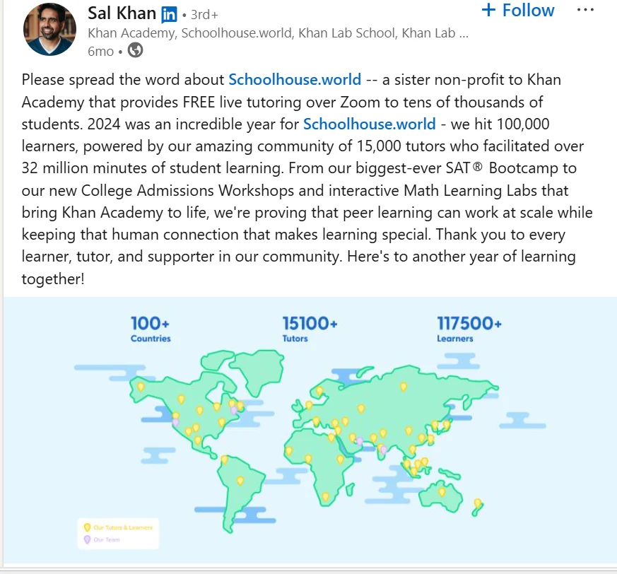 Schoolhouse.world is global. As of 2024, it reports over 180 countries of users, with around 18,000 volunteer tutors and 140,000 learners worldwide. The platform is primarily in English, but it aims to serve students everywhere. Tutors and students join from the USA, UK, Canada, Australia, Gulf countries, and beyond. (For example, Sal Khan noted reaching 100,000 learners across the globe in 2024.) Localizing in other languages may grow in the future, but currently most sessions are in English or with bilingual volunteers.