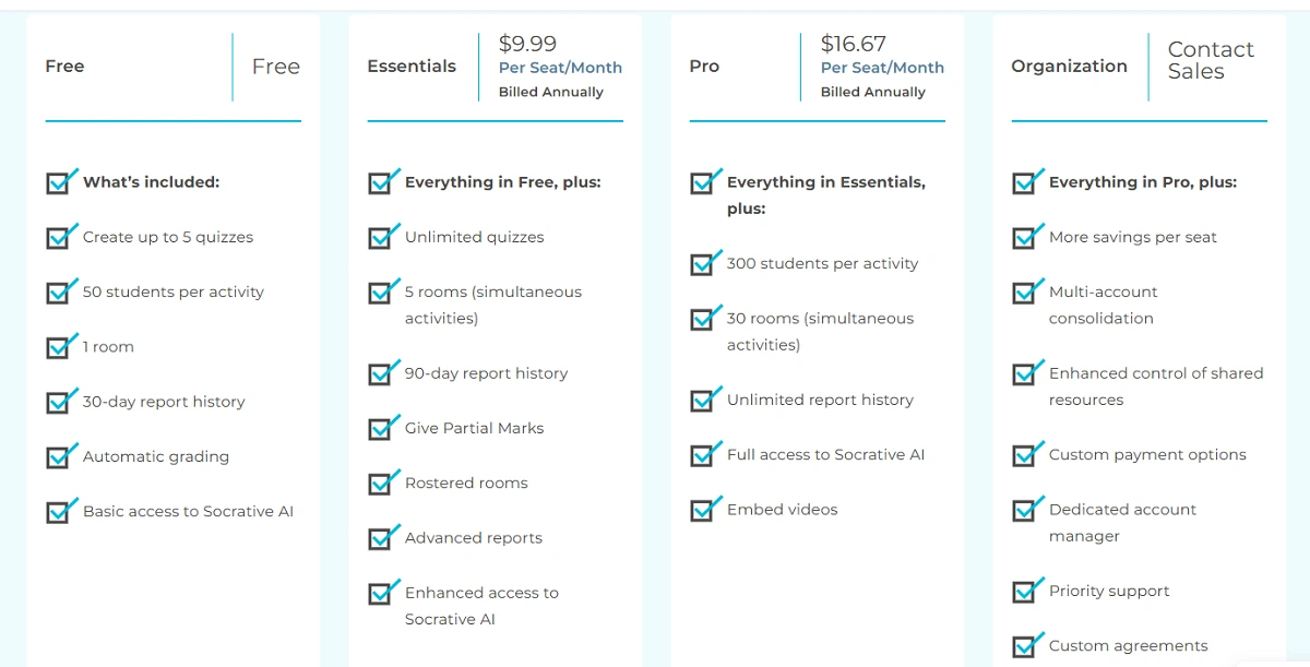 • Essentials: $9.99 per teacher per month (billed yearly). Includes unlimited quizzes, 5 active rooms, 90-day history, and extra features like partial grading and rostered classes.