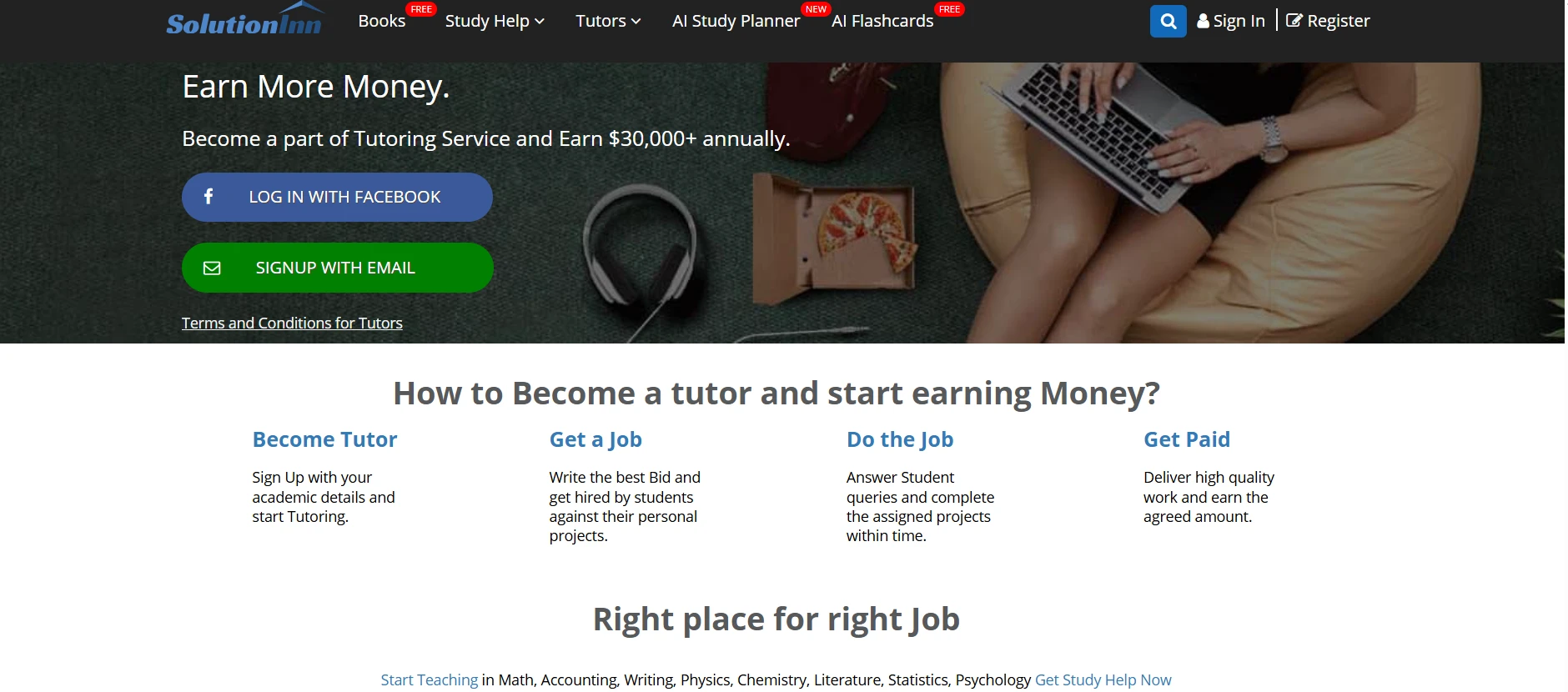 Once approved, tutors can bid on student questions. The platform’s site outlines a four-step cycle: tutors Sign Up with details, Get a Job by writing the best bid on a project, Do the Job by answering student queries, and Get Paid for the work. In practice, when a question is posted, tutors see it and submit offers. If chosen by the student, the tutor provides the solution and the agreed payment is released. SolutionInn claims tutors can earn a significant income this way (the homepage even claims “Earn $30,000+ annually” for active tutors). Tutors are paid in a timely manner after delivering answers. Payout methods are not detailed on the site, but tutors report receiving regular payment for accepted work.