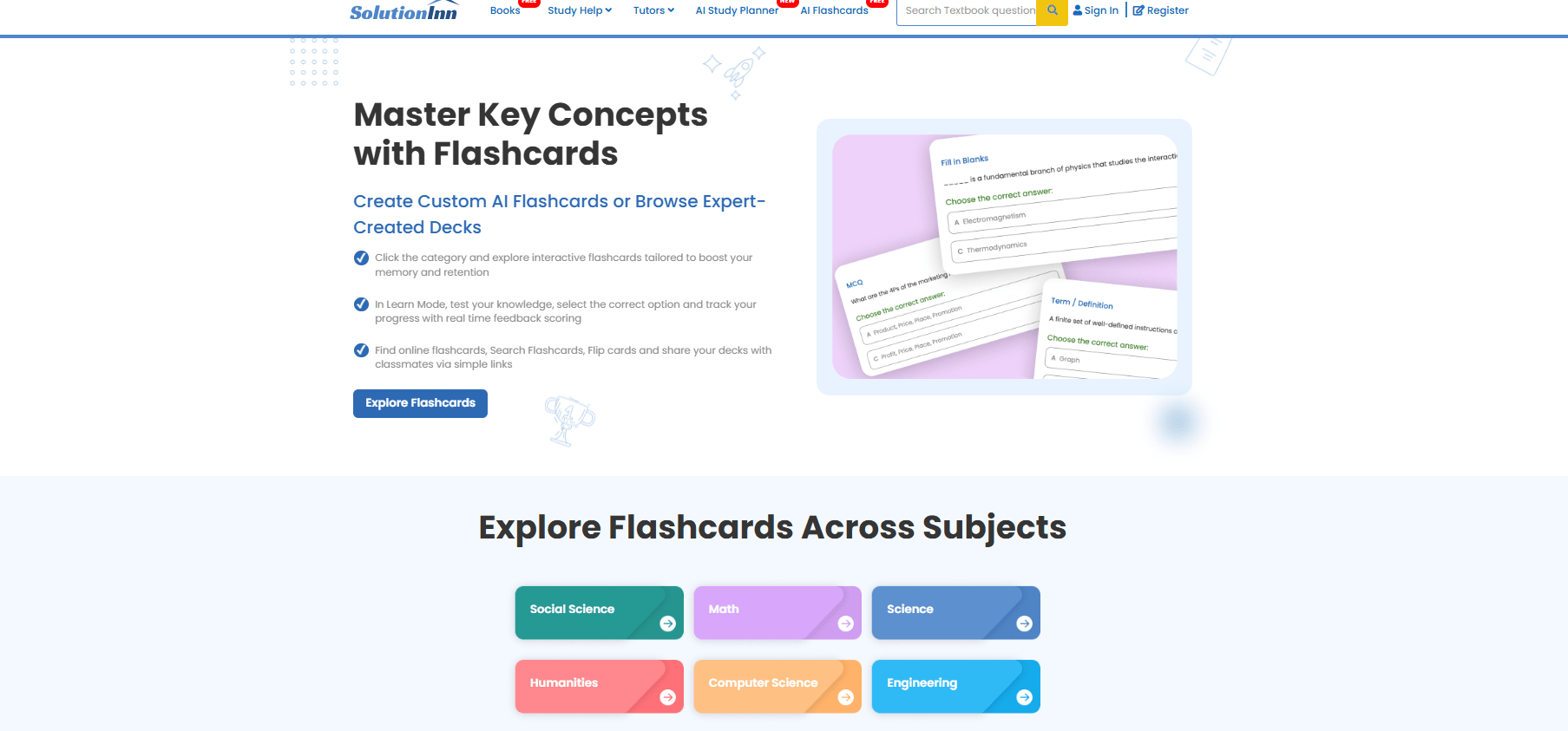 SolutionInn is looking to expand its AI capabilities and platform features. Already, it highlights an “AI-Study Help” chatbot that answers student questions instantly using machine intelligence. The site also introduced an AI flashcard generator for efficient studying. These suggest a strong focus on AI-driven learning tools. The company likely plans to enhance these – for example, better interactive tutoring with AI guidance. Beyond AI, they may increase their solution database (it has grown from 1 million in earlier years to over 30 million now). Expansion into new subjects or exam prep, and improving mobile apps, are also possible directions. Given the competition (Chegg, Course Hero, etc., often use tech-driven personalization), SolutionInn seems intent on staying current with edtech trends. For 2025 and beyond, expect more AI personalization and perhaps partnerships with universities. However, no official roadmap is published, so these are inferred from current features.