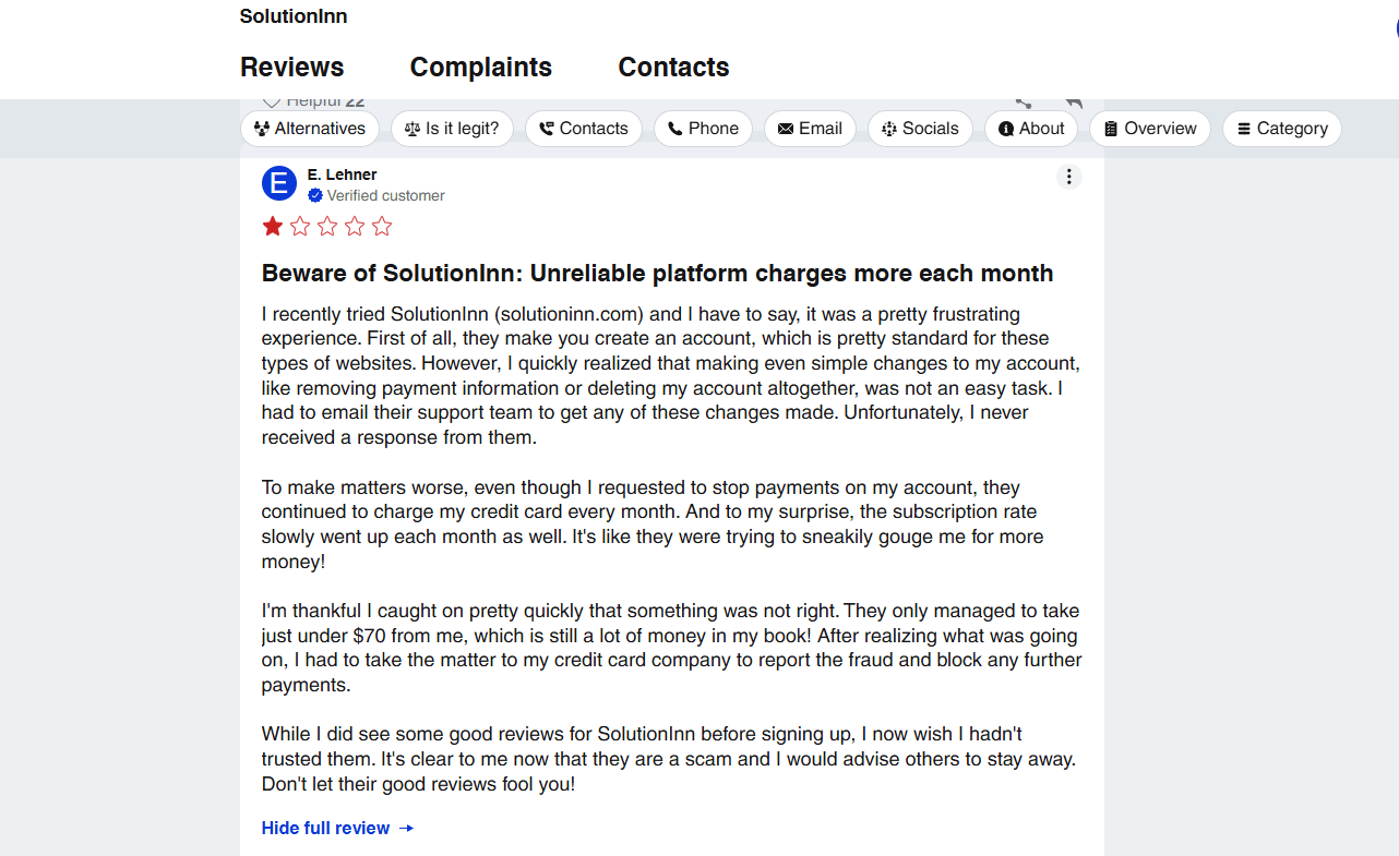 SolutionInn offers online support via FAQs, email, and a help portal. Official pages provide how-to guides (e.g. on cancelling membership, and requesting refunds). However, independent reviews suggest that response times can be slow and resolutions uneven. The Better Business Bureau lists SolutionInn with an F rating (it is not BBB-accredited) and multiple unresolved complaints. Scam-advisor checks SSL and domain age and finds no technical scamred flags, but relies on user reviews to judge trust. In short, while SolutionInn does have formal support channels, the general user consensus is that support is not very strong. Prospective users should follow up carefully and document all communications. Strong points: no widespread data breach reports and valid payment security. Weak points: lack of accreditation and repeated billing complaints. Trustworthy or not often depends on personal experience – the majority of verified reviews suggest caution.
