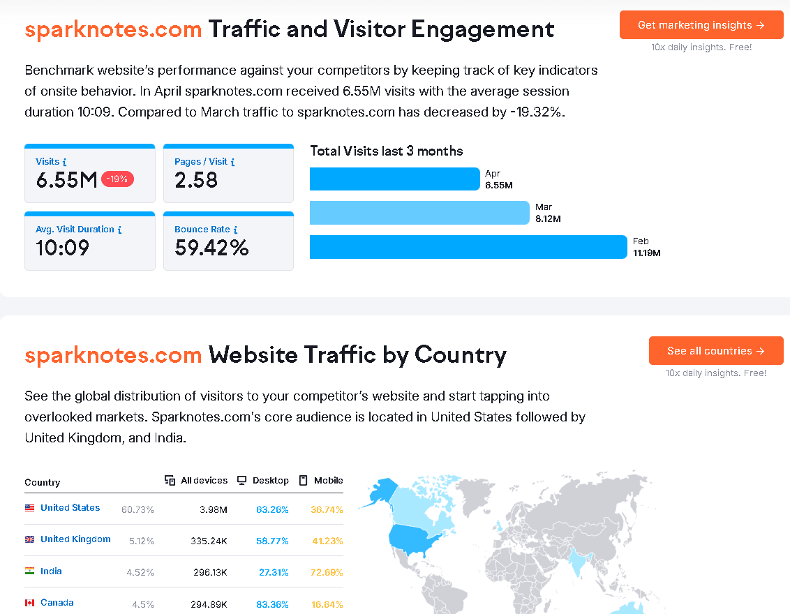 Scale and Reach: In 2025, SparkNotes is a massive online resource used by students globally. The site is available in English and attracts millions of visitors each month. In the United States, SparkNotes is among the top education websites, with roughly 7-10 million visits per month as of early 2025. Its user base spikes around exam times and when big reading assignments are due. SparkNotes has over a thousand literature guides in its library and covers hundreds of other topics and textbook subjects. Popular guides like The Great Gatsby or Romeo and Juliet have been read by countless students. SparkNotes also produces printed books – there are SparkNotes compilation books and the No Fear Shakespeare series in print, which have millions of copies in circulation. The platform’s reach extends beyond the U.S. and UK; students in international schools in Europe, the Middle East, and Asia also use SparkNotes to supplement their English-language curricula. The premium SparkNotes Plus service, as mentioned, is officially available in about 7 countries (including the US, UK, Canada, Australia, etc.), but the free site can be accessed from anywhere. This means even if a student is in, say, the Gulf region or South Asia, they can still use the free guides to help with their studies in English literature or other subjects. SparkNotes has truly become a global study companion for English-speaking students around the world.