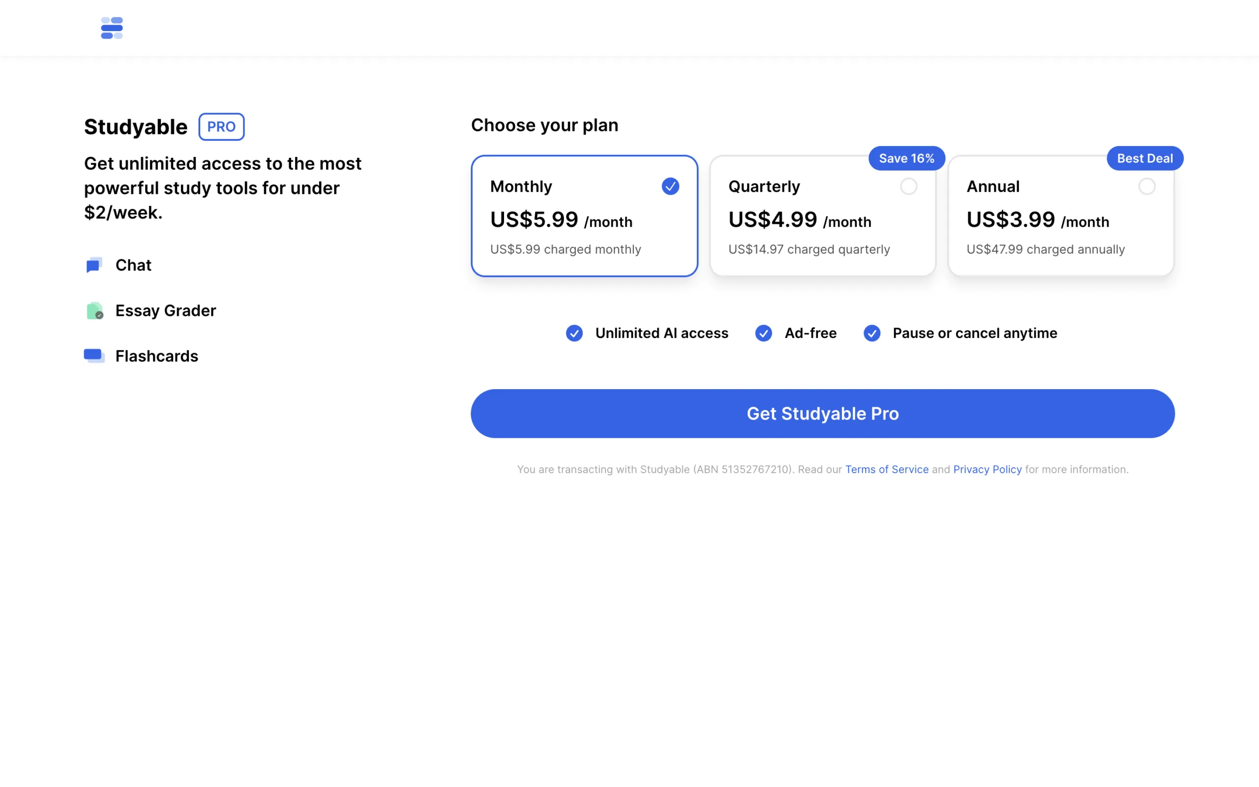 • Free Base Plan: Studyable’s core features are free with no charge (with usage limits), so students can try it without risk.
