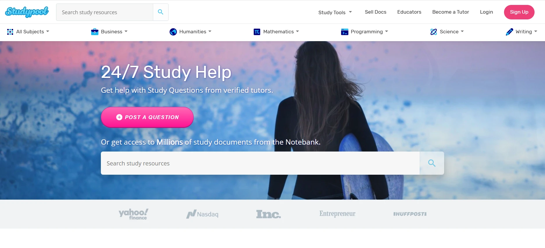 A: Students post a question and set a budget. Tutors then bid to answer it. Typical question budgets vary (often $5–$40 in examples). You pay the agreed price after receiving the answer. Alternatively, you can subscribe to Studypool’s Notebank for 10 study downloads per month (about $19.95/mo or $59.40/yr).