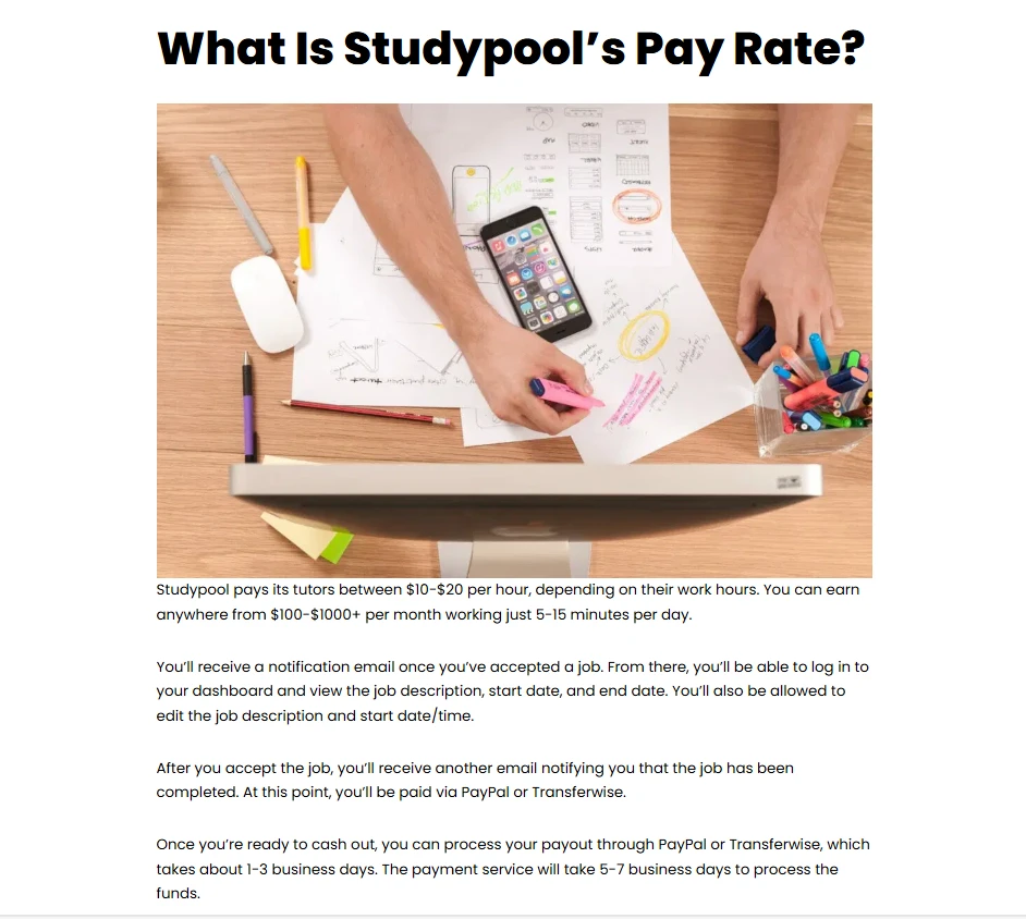 A: When a student approves an answer, Studypool releases payment to the tutor (minus commission). Commission typically starts around 20%, though new tutors pay 15% on early answers. Many experienced tutors report commissions of 15–30% per question. There is no hourly rate – tutors earn per question solved.