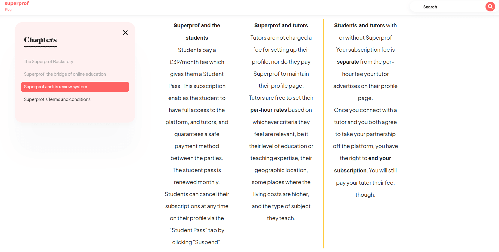 Are there hidden fees? The only required fee is the Student Pass for students. Superprof does not charge commission or booking fees beyond that. Still, users should be aware that contacting tutors costs the subscription, even if no lesson happens.