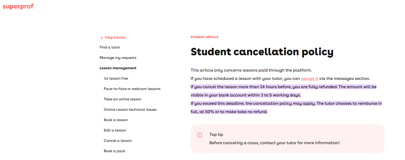 Superprof’s official policy allows refunds for scheduled lessons: if you cancel a booked lesson more than 24 hours before the lesson starts, you get a full refund to your bank account (within 3–5 business days). If you cancel later, the tutor’s cancellation policy applies and you may only get 50% or 0% back, depending on their terms. Critically, Superprof does not refund the monthly Student Pass after it is billed. Users report that once you have paid for a month of access, Superprof won’t refund that fee even if you never took a lesson}. In short, lesson cancellations can be refunded per policy, but the subscription fee is generally non-refundable once paid.