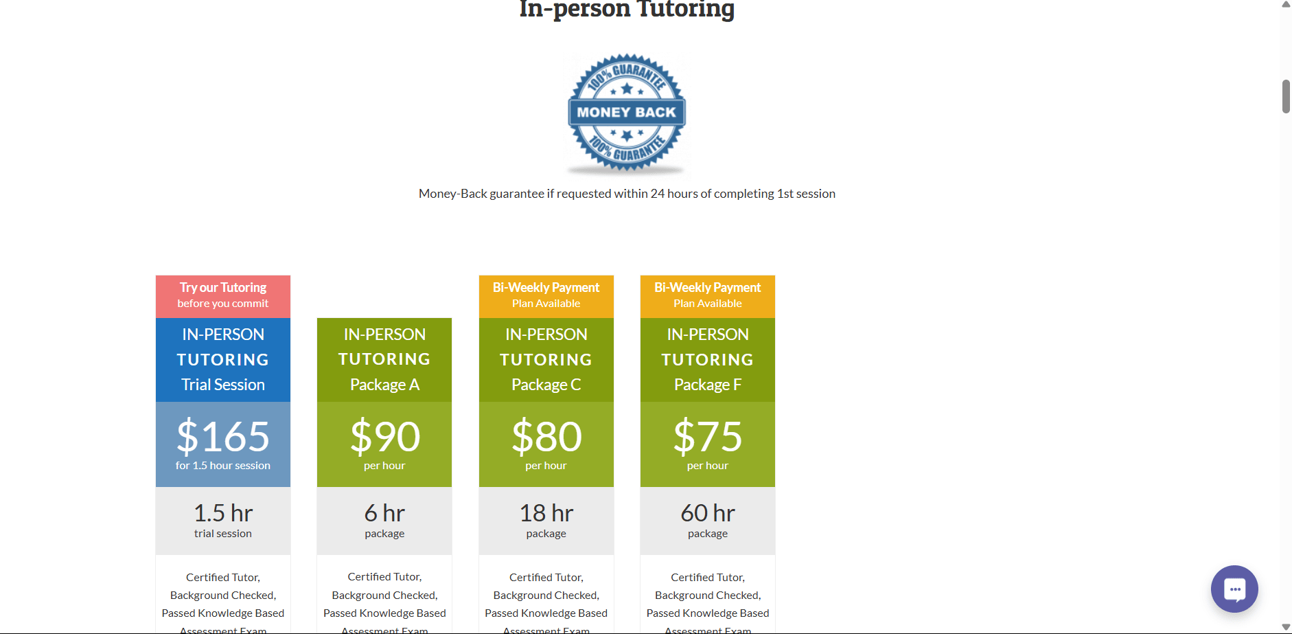 • Higher Prices: The trial session rates ($80+ per hour) and package fees are on the high side. There is no free trial—only a paid, refundable trial.
