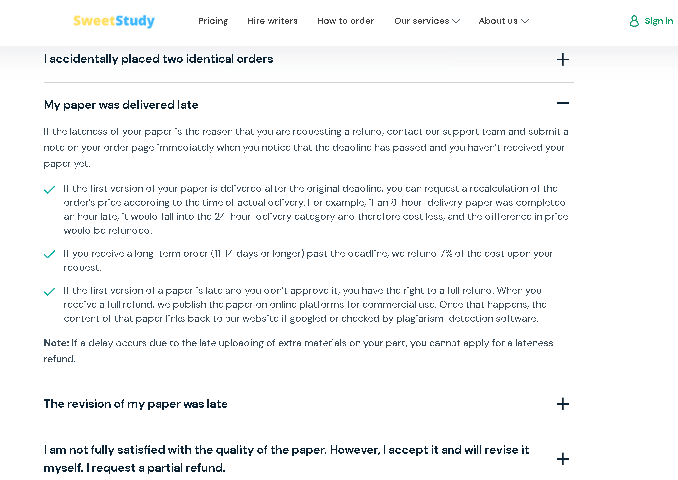 A: The cost varies depending on your task. There’s no fixed price – you post your question and tutors will offer prices. Simple questions might cost around $5-$15, while complex assignments could be $50 or more. SweetStudy itself is free to join and post; you only pay when you accept a tutor’s offer. Do remember a $0.90 service fee is added to each payment. Compared to subscription services (like Chegg’s $15/mo or Course Hero’s plans), SweetStudy can be cheaper if you only need occasional help, but for lots of questions it can add up. - Q: Does SweetStudy offer refunds if I’m not satisfied?