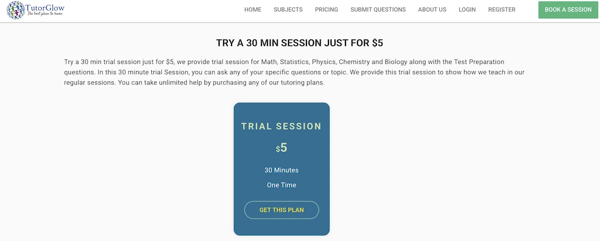 TutorGlow offers a 30-minute trial session for just $5 in specific subjects including Math, Statistics, Physics, Chemistry, and Biology, plus test preparation. This affordable trial lets students experience the platform and teaching style before making larger purchases. Students can book their trial at tutorglow.com/pricing.php.