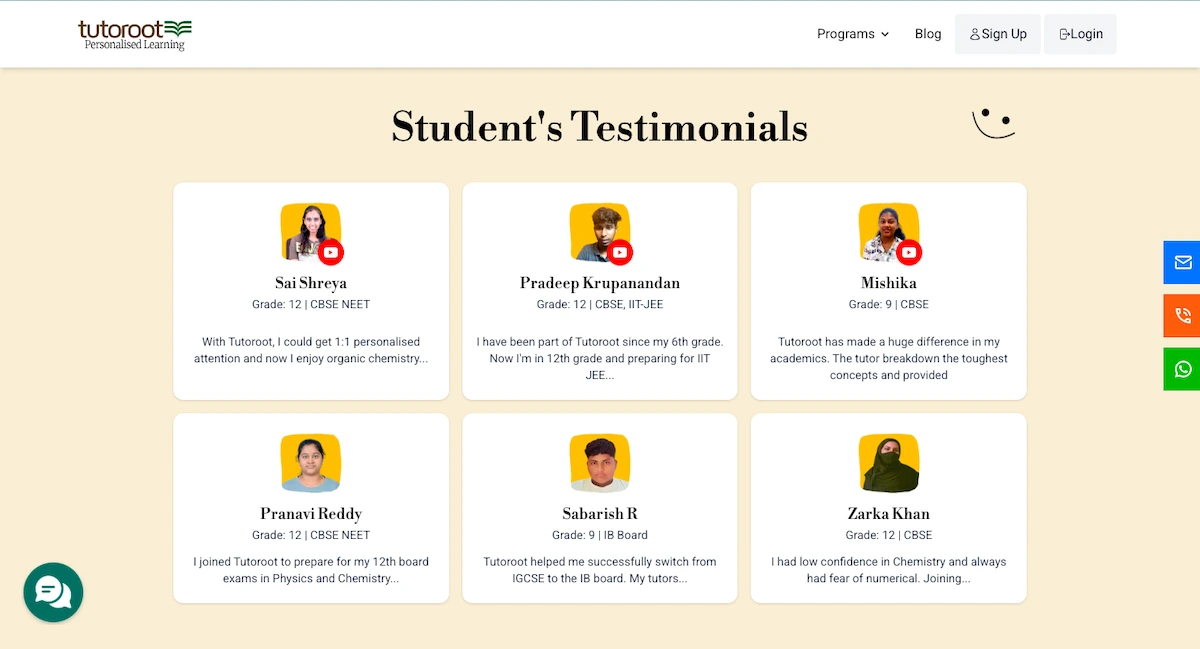 Tutoroot Official Website: Tutoroot’s own site features curated student testimonials. These highlight benefits like 1:1 attention and expert tutors (for example, a Grade 12 student from CBSE says she enjoys organic chemistry with Tutoroot’s help). Such testimonials are uniformly positive about personalized learning and qualified teachers. However, these are company-selected quotes and not independently verified.