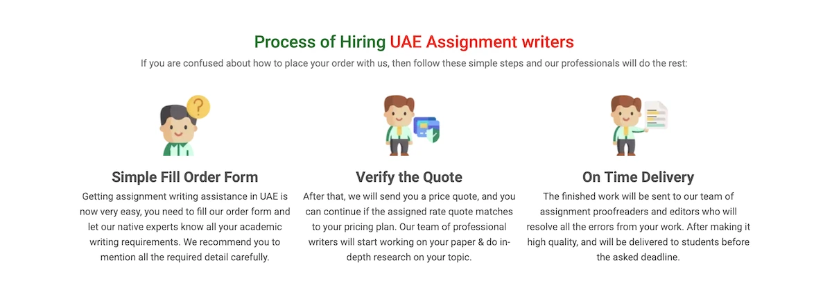 Signup Process for Students and Parents: Go to the UAE Assignment Help website and click on the order form. Fill in your assignment details including subject, deadline, academic level, and specific requirements. Provide your email and contact information for communication. The company sends you a price quote based on your submission. Review the quote and proceed if satisfied with the cost.