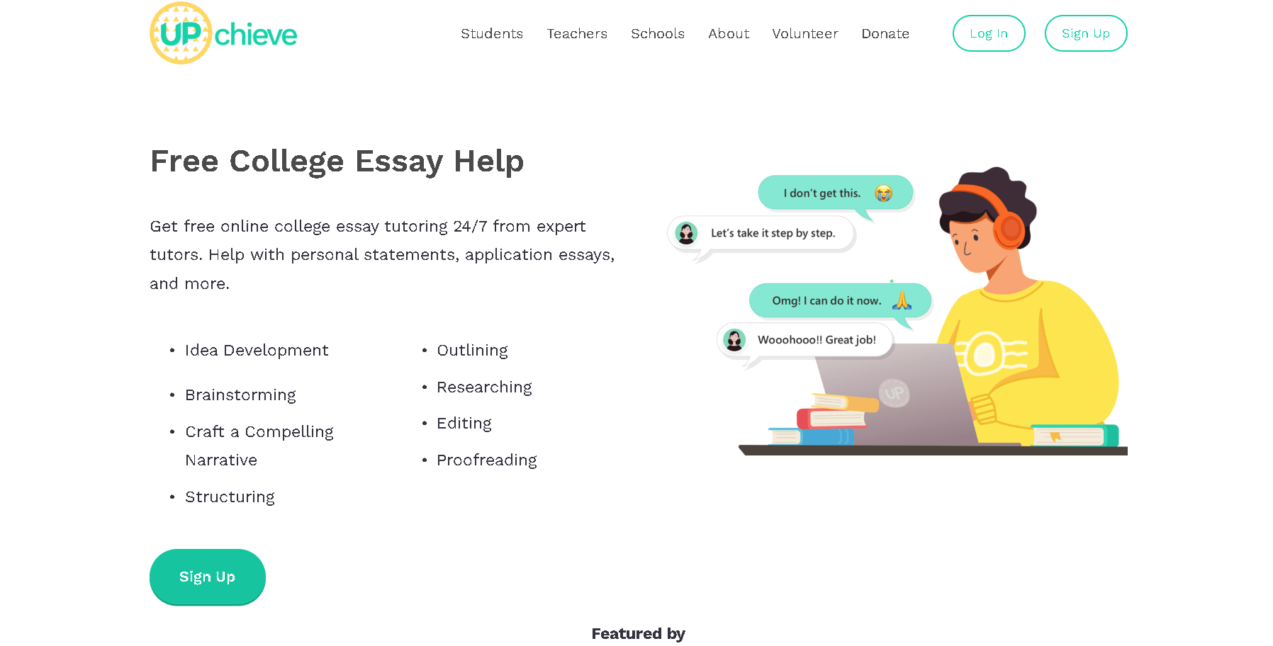 How do I sign up? Go to Upchieve.org or download the Upchieve app, and create an account. You do not need your school’s or parents’ approval. After signing up, select your subject and you will be matched with a tutor or counselor within minutes.
