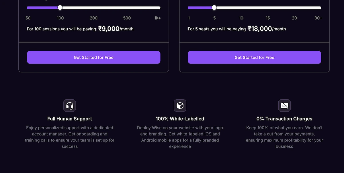Wise’s website does not mention any hidden fees. There are no registration charges, platform commission, or cancellation fees specified. Zoom integration is built-in (so no extra video costs). The only ongoing cost is the per-session charge. Any optional add-ons (like custom development or large enrollments) would be disclosed during sales talks, but basic use has no surprise fees.