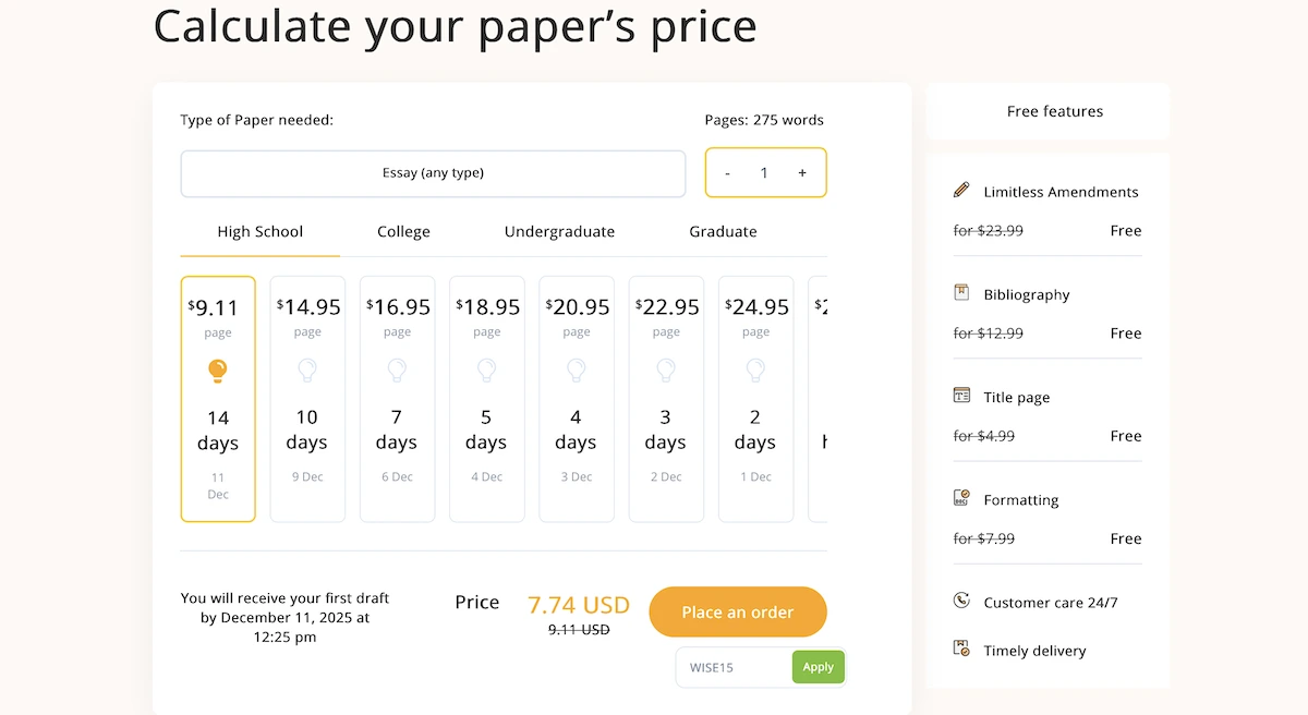 - Affordable Starting Prices: WiseEssays advertises starting prices from $7.74 per page. However, most independent reviews indicate that base prices are misleading. Hidden fees, revision needs, and add-on charges significantly increase the final cost. While competitors may charge more upfront, the total cost is often comparable after all fees. Students seeking the absolute cheapest option will find WiseEssays appealing initially, but actual value may not match expectations.