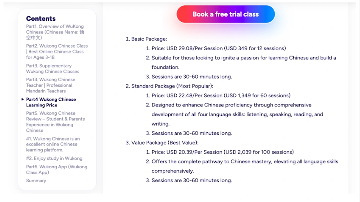 WuKong sells classes by credit packages. For example, Chinese programs cost about $349 for 12 sessions and $1,349 for 60 sessions (roughly $24–29 per lesson). Math courses run about $286 for 10 classes and $1,249 for 50 classes. In short, each 30–90 minute lesson typically costs in the $20–30 range depending on package size.